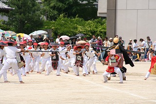 どの学校でも高学年の演目で組み立て体操があると思いますが、この学校が変わっているのが(私にとっては普通ですが)、大樹寺を舞台とした、戦国時代のお話を演劇仕立てでそれが行われることです。(学習発表会でも・・・)