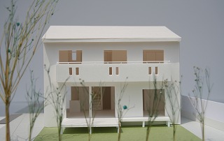 下は計画案提出時の模型と外観パースです。2階のボリュームが今と比べ小さかったのです。