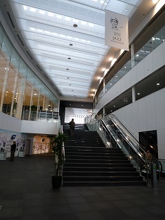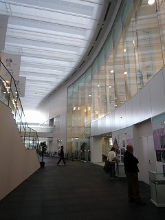 1階の駐車場に停めて、出たところが「お堀通り」と呼ばれる、ゆるやかな曲面のふくらみをもつ交流スペースです。