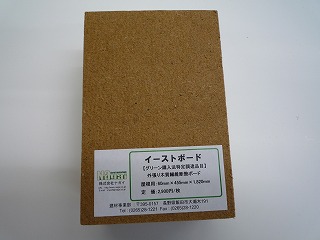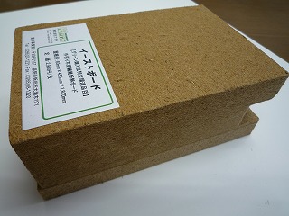 遮熱機能をもつ断熱材として、他にも、先日(株)ナガイの所長と打合せした時にサンプルとしてもらった「イーストボード」というリサイクル木材を利用した断熱材があります。