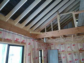 一般的には、遮熱機能のない、普通の透湿防水シート(内部からの湿気を通すが、外部からの雨水は通さない)を張ることが当たり前に行われていますが、この家は大きな吹抜があるので、空調ロスを抑える省エネと快適性向上のために、アルミを蒸着した透湿防水シートを張っています。