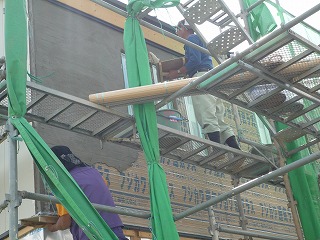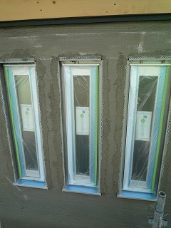 今日はここまでですが、後日乾燥した後、クラック防止のネットを伏せこみながら、モルタルの上塗りを行い、ようやく吹付材のための下地が完成します。