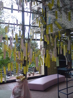 ホールに入ると大きな七夕の竹が。子供達は短冊に願い事を書いて、竹にくくり付けました。