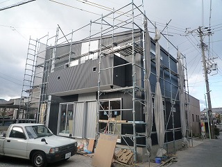 とうとう外壁の金属サイディング(断熱材サンドイッチ両面ガルバリウム鋼板)が張り終わりました。