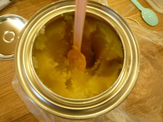 今回使ったのは、「未晒し蜜蝋ワックス」のCタイプというバター程度のやわらかいタイプを選びました。