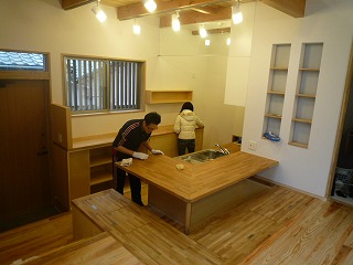床の無垢の杉フローリングなどに、蜜蝋(みつろう)ワックスを、お施主様と一緒に塗るためです。