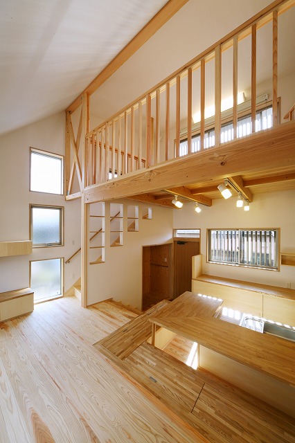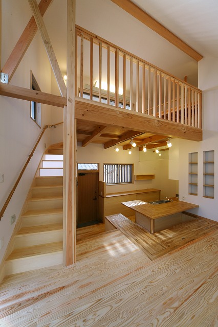 2階ロフト(と呼んでいる部屋)の大きな南窓から差し込んだ光が、手摺の杉格子を通して、LDまで届きます。