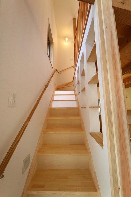 夜は、足元照明として、昼は、階段下収納に照明を点けなくても、階段から通した光で明るくします。
