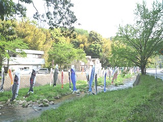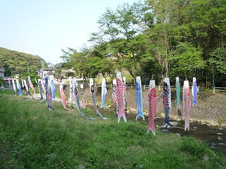 このシーズンになると、青木川に多数のこいのぼりが泳ぎ、圧巻です。