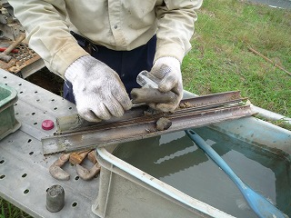 サンプラーと呼ばれる筒の中に土が入り込み、1mごとに土を部分的に採取し、プラスチック容器に保管します。