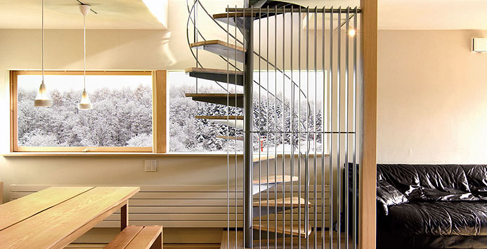 写真のらせん階段手前のスクリーンみたいなものが冷暖房装置です。