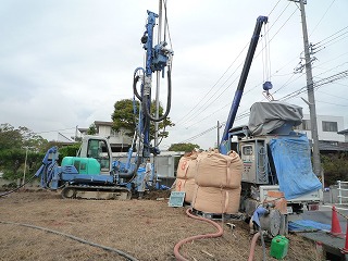 設計中に行った地盤調査の結果、地盤補強が必要なことが分かっていましたので、まずは、その工事を行います。