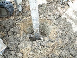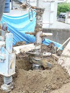 柱状改良という工法で、土中深くドリルで掘削し、その土とセメントを溶かした液をかき混ぜて、柱状に硬くするのです。