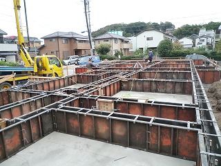 前回、「ベース」と呼ぶ、ベタ基礎の底盤部のコンクリートを打ちましたが、今回は、土台が乗る「立上り基礎」のコンクリートの打ちを行いました。