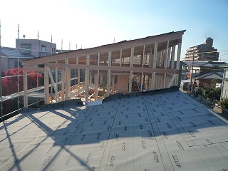 屋根の野地板が張られ、防水ルーフィングが敷かれました。