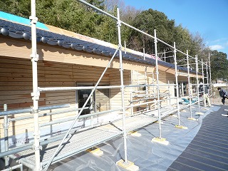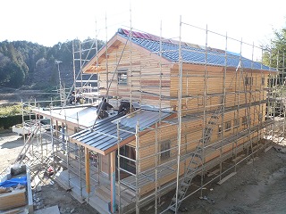 2階屋根に瓦が葺き終わり、1階屋根にガルバリウム鋼板を葺いています。