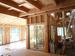 外壁の耐力面材下地には、「木ずり」と呼ばれる幅広の板を全面に1cmくらいすきまをあけながら、びっしりと張っています。