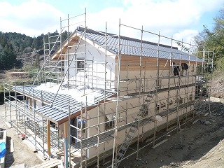 外壁下地の木ずり(木ずりの下には、地震対策のダイライトという耐力面材が張ってあり、さらに一部には筋交いもあります。木ずり自体も耐力壁の要素です。)の上に、塗り壁専用の白い透湿防水シートが張られました。