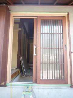 木製玄関引き違い戸に、こげ茶塗装(ドイツ製自然塗装プラネットカラー)されました。