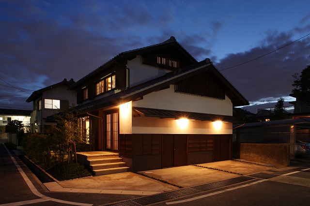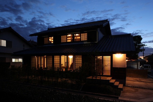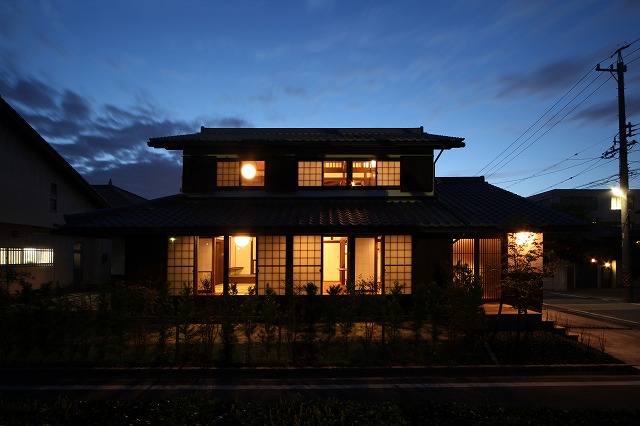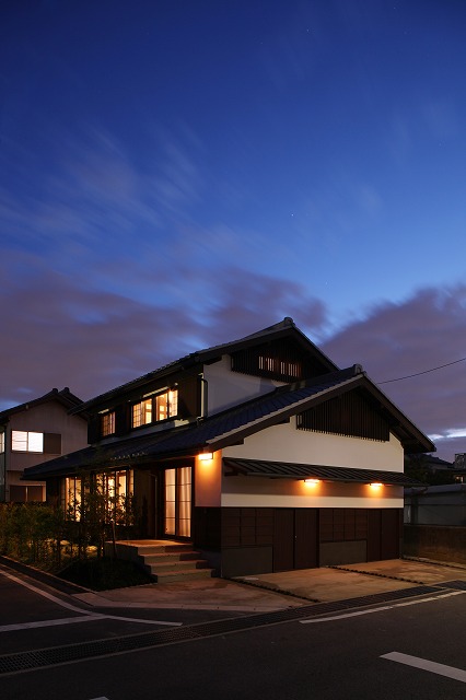 古民家スタイル「刈谷の懐/廻の家」の竣工写真の続きで、外観の夕景です。最終回。