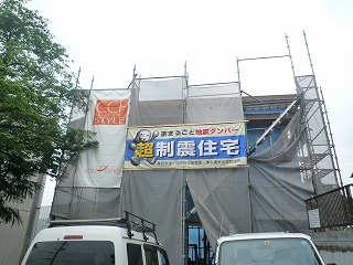 お施主様であり大工の中嶋さんの、ブログ以外での初めての営業活動として、足場に2枚の大きな広告シートが掛けられました。