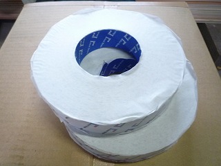 このテープ(↑写真は間柱用の幅狭タイプですが、柱用は100mm幅の幅広タイプです)を外周部の柱などの構造体に張り、その上に耐力面材(今回はモイス)を張っていくのです。