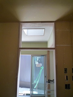 そこで、東に隣接する家事室との間にランマを2箇所(↓写真で写っていない場所にもう1つあります)設け、家事室の屋根に設けたトップライト(天窓)から、光を導くことを考えてあります。