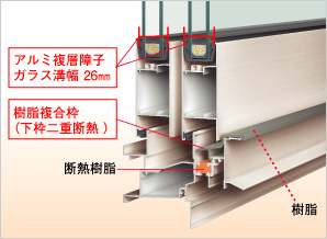 アルミは熱を伝えやすいので、外部側のアルミ部材と室内側のアルミ部材の間に熱の伝わりをブロックする断熱樹脂がはさまっています。