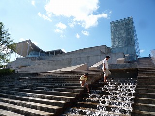 ガラスの巨大な箱やコンクリートの箱が傾斜面に埋めこめれているようなデザインです。