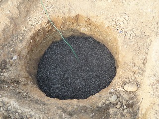 「埋炭」とは文字通り、炭(木炭や竹炭)を埋めることで、家の中央付近のベタ基礎の下となる部分に、直径1m、深さ1mの穴を掘り、炭を埋めるものです。
