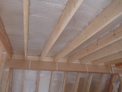 ↑屋根断熱材の上には、遮熱断熱シート「アストロフォイル」で屋根通気層を確保しています。