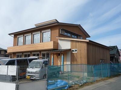 外壁のシラス・そとん壁と杉板がいい感じです。