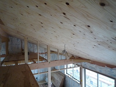 この家では、なるべく国産材を使いたいというお施主様の意向もあり、国産杉で作られた杉合板を、天井だけでなく、2階剛床にも使っています。1階に天井を張らない部屋もあるので、そのまま見せるところもあります。