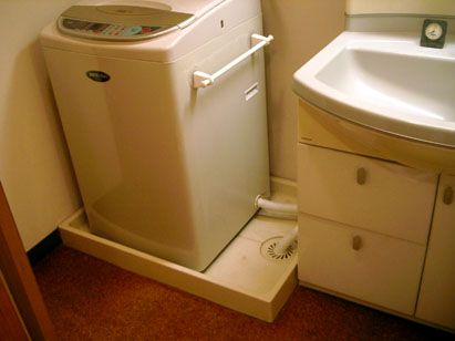 上の写真のように、マンションやアパートなどでは、万一、洗濯機廻りで、水漏れした時に、下階へ浸水被害がなるべく及ばないように、「洗濯機防水パン」という、排水口のついたプラスチック製の大きな四角いお盆のようなものの上に、洗濯機を乗せるようになっています。