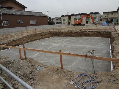 ↑北棟のコロンブス工法による地盤改良の後に、捨てコンクリート(調整コンクリート)が打設されたところです。