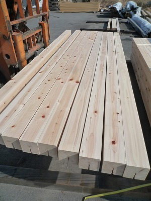 昔の家と違って、今回は、大壁造りの家なので、ほとんどの柱(東?濃ヒノキ)は、壁の中となり、見えなくなりますが、部屋の中で自?立する独立柱や、ポーチや外縁に立つ独立柱は、そのまま、あわら?しとなります。