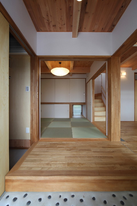 ↑土間(玄関)から広縁(玄関ホール)ごしに、和室を見たところ。和室から見れば、ホールは「広縁」であり、玄関は「土間」なのです。和室の地窓から風が抜けます。