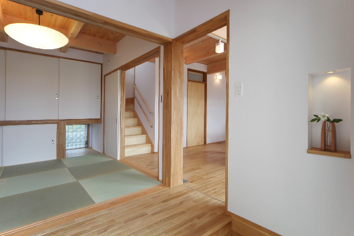 ↑土間には、小さなニッチ(飾り棚)があります。写真中央の柱を中心に、「広縁」、リビング、和室の回りをぐるぐる廻れ、広がりと開放感を生み出します。