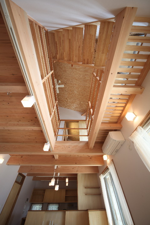 ↑リビングの吹抜を見上げたところ。リビング吹抜の南側は、「吹抜縁」と呼んでいる、すのこ床の通路です。光と風が各階を通ります。吹抜の上には、ロフトへ上がる階段があります。