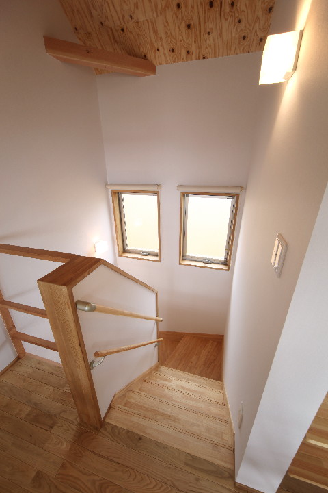 ↑リビングから、上がれる階段。2階から見たところ。階段の北窓を通して、風が抜けます。特注で作った、細めの子供用の手摺が、普通の手摺の下についています。