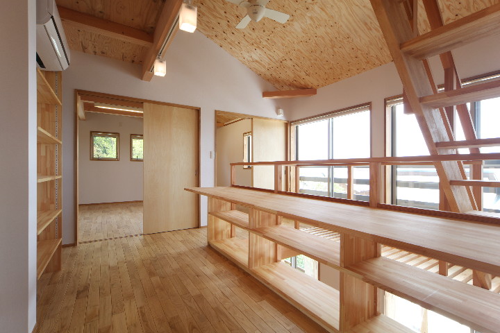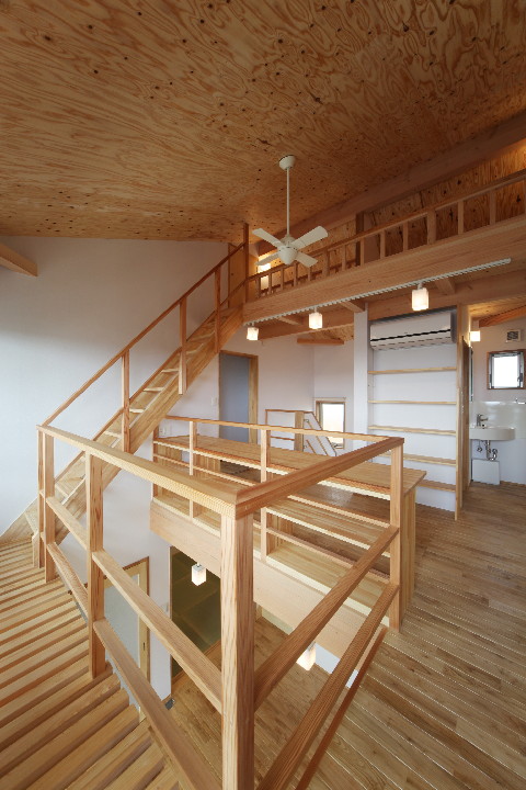 ↑吹抜縁をぐるりと回ると、ロフトへ上がる階段があり、浮遊感がおもしろいです。勾配天井は、国産間伐材利用を促進したいとの思いから、杉合板としています。天井のシーリングファン(天井扇)で、冬の暖気や共用コーナーのエアコンの冷気を1階へ引き下します。また、中間期は羽根を逆回転して、上昇気流を造り出し、風通しをよくします。