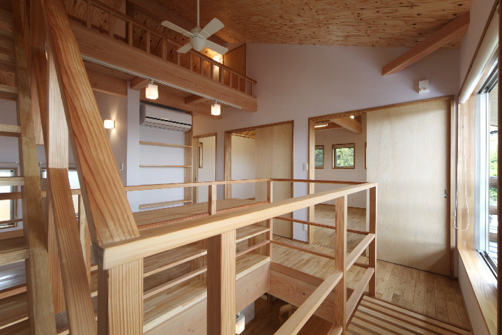 ↑共用コーナーに面する3つの引違戸は、3人のお子様たちの各部屋への出入り口ですが、片開きドアを3つ並べなかったのは、共用コーナーや吹抜を介して、1階への結びつきを強めたかったからです。また、引違戸を外してしまえば、共用コーナーと一体となった、大空間が現れます。