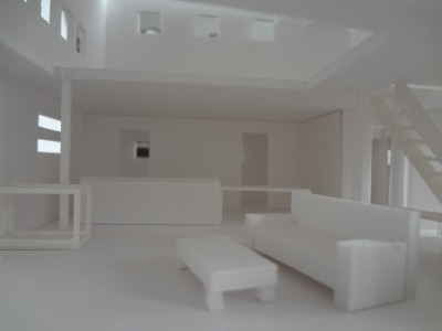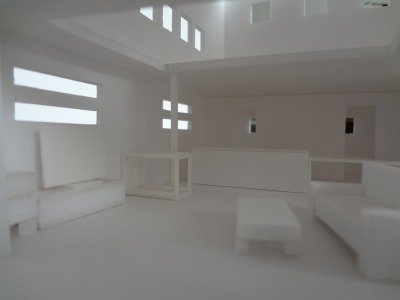 白模型ですが、内部に、ソファやTVや犬ケージや薪ストーブや階段を作りこみ、少しでも分かりやすくなるようにしました。