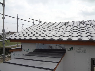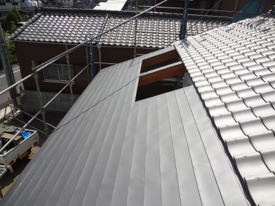 2つの渡縁(わたりえん=渡り廊下のこと)の屋根は、ガルバリム鋼板の立平葺きとしています。