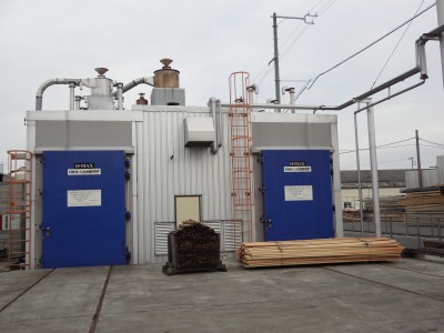 ↑皮や工場から出たカット端材は、燃焼させ、バオイマスエネルギーとしてその熱を、↓高温乾燥釜で利用しています。
