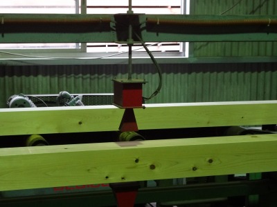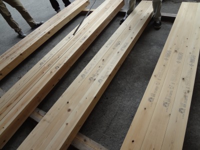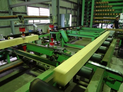 ↑乾燥された木材は、検査員によって、目視での検査を受け、合格した角材は、機械による検査を受けます。