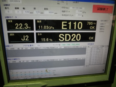 ↑これらの計測値は、コンピューターで管理され、↓含水率と強度、シリアルナンバーなどが、角材に印字されます。