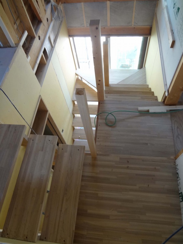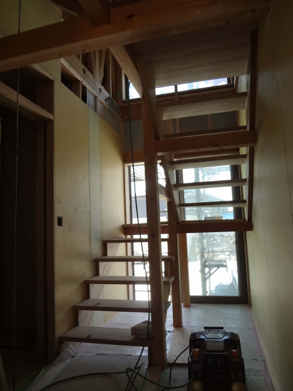 階段越しに、窓の向こうに、中庭4が見えるようになります。