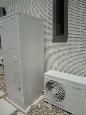 ↑これはオール電化住宅で採用される、エコキュートで、ヒートポンプ(エアコンの室外機みたいな機械)で作ったお湯を給湯タンクに貯めます。