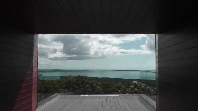 ↑窓がなく暗く、天井の低いトンネル状の空間の向こうに、開放的なガラス手摺の展望デッキが広がり、開放感を高めています。アプローチは、楽しげなスロープ+階段とエレベーターの2種類あります。